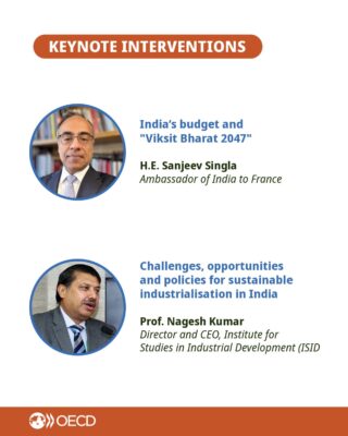 | OECD Development Centre hosted a talk on India under its DevTalks series at its headquarters in Paris on May 20, 2025. The event began with opening remarks on India’s Viksit Bharat Vision by the Ambassador of India to France H.E. Sanjeev Singla. It was followed by a keynote by Prof Nagesh Kumar on Challenges, Opportunities and Policies for Sustainable Industrialization in India based on ISID’s India Industrial Development Report 2024-25. The event, moderated by Ms Ragnheiour E Arnadottir, Director, OECD Development Centre, also featured remarks by Ambassador of Ireland and Chair of the OECD Development Centre Board, H.E. Shai Cohen, Ambassador of Israel, Dr Isabell Koske of OECD Economics Department, Thomas Spencer of International Energy Agency, Dr Federico Bonaglia, Dy Director, OECD-DEV, and Prof Fabrizia Lapercorella, Deputy Secretary General, OECD. There was a consensus on India’s economic prospects and its ability to emerge as the global growth locomotive with its demographic, geopolitical and other advantages and its vision focused on inclusive and sustainable development. |
