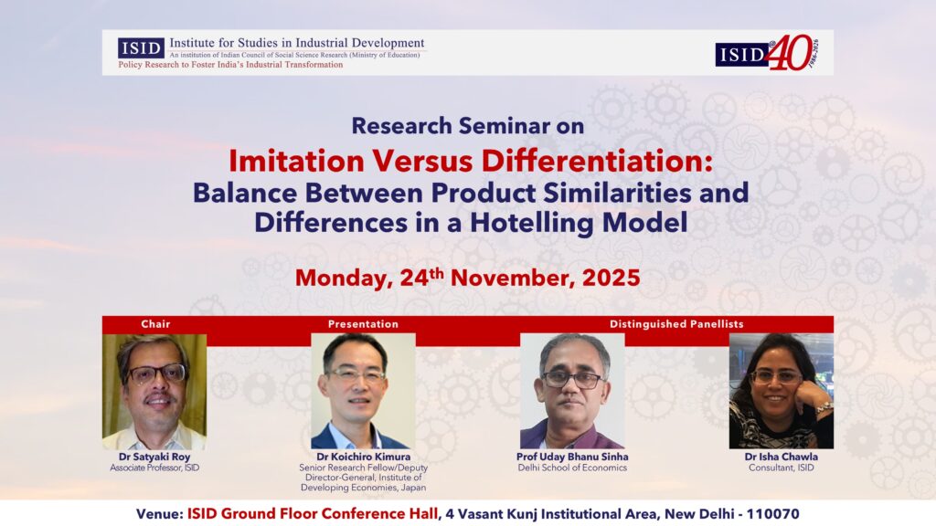 | ISID organised a Research Seminar on “Imitation Versus Differentiation: Balance Between Product Similarities and Differences in a Hotelling Model” on November 24, 2025 at the ISID campus, New Delhi. Dr Koichiro Kimura, Senior Research Fellow and Deputy Director-General, Institute of Developing Economies, Japan, presented his study. The study examined how firms balance product differentiation with imitation to maximise profits, incorporating the costs of both strategies into a Hotelling model to explain product similarities and diversity across industries. The session was chaired by Dr Satyaki Roy, Associate Professor, ISID, and the distinguished panellists were Prof Uday Bhanu Sinha, DSE, and Dr Isha Chawla, Consultant, ISID. The seminar concluded with an engaging discussion and Q&A session with participants. |